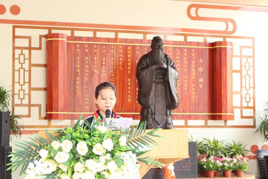 活動的第一部分是孔子像揭幕儀式。首先由各位領導為孔子像揭幕,隨后由二年級學生在古琴音樂的伴奏下誦讀《論語》。聽著悠然的古箏聲伴隨著韻味十足的郎朗書聲,我們仿佛置身千年之前的課堂,并深深陶醉于濃濃的國學氛圍之中。
