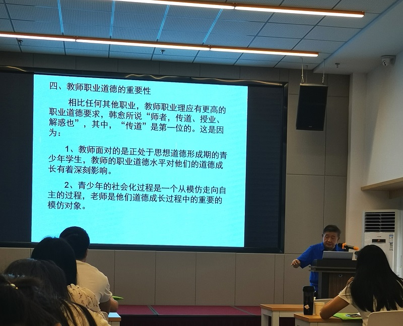 最后,廣東省人民政府教育顧問、華南師范大學(xué)張俊洪教授為在場(chǎng)班主任作了“新時(shí)代教師職業(yè)道德建設(shè)新樣態(tài)”專題報(bào)告。張教授用豐富的人生經(jīng)歷,簡(jiǎn)約而不簡(jiǎn)單的語(yǔ)言講述了新時(shí)代教師職業(yè)道德面臨的現(xiàn)狀、挑戰(zhàn)以及作為一名教師應(yīng)有的堅(jiān)守。