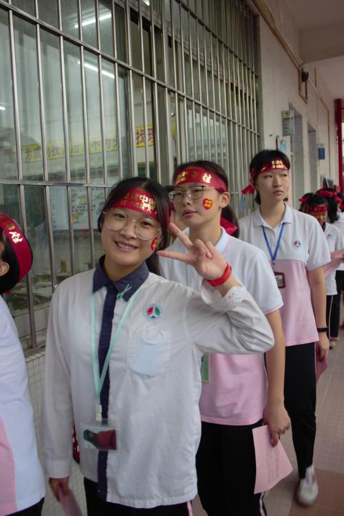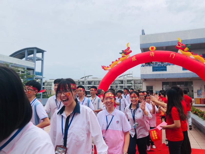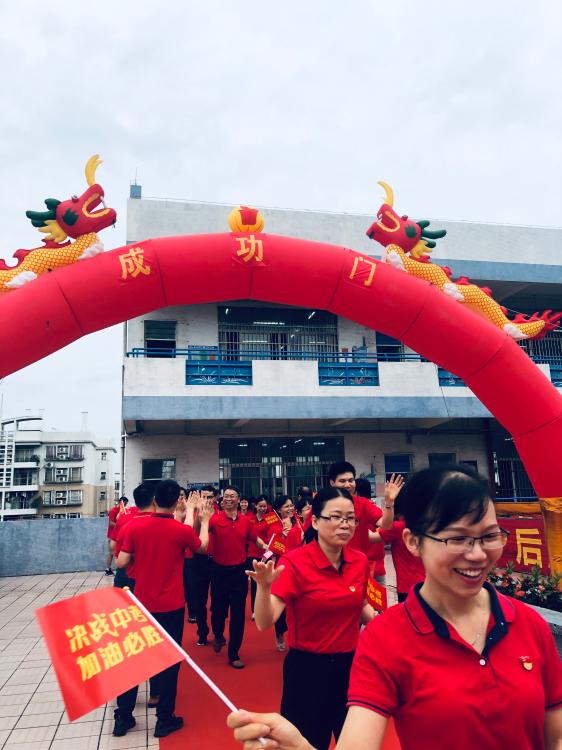 瞬時,同學們那渴望而又激動的眼神聚焦于“成功門”,仿佛那就是心之所盼的未來!各班的領隊同學都默默地緊握班旗的旗桿,在班主任的帶領下,同學們整理好額上的紅絲帶,邊氣勢如虹地高喊口號邊有序地走過“成功門”。“成功門”兩側早有初三級的科任老師列隊靜候著,他們?yōu)槌跞龑W子搖旗吶喊,擊掌壯行,為這莊嚴的場面增添了一份溫情!