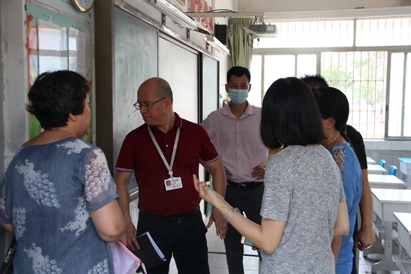 在廖杏芳校長、李敬明副校長、蔡泳儀副主任等校領導的陪同下,教育局領導們認真察看了校園環(huán)境、教學樓、校醫(yī)室、防控物資儲存室、功能場室等重點場所,深入了解學校疫情防控工作方案、防疫物資配備等準備工作。