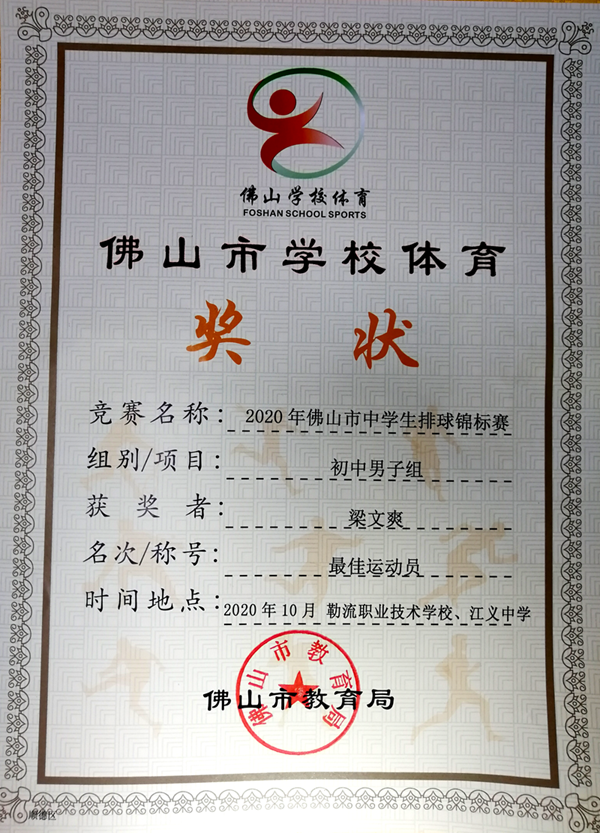 2020年10月30日至11月1日,由佛山市教育局主辦,順德區(qū)教育局承辦,順德區(qū)勒流江義中學(xué)和順德區(qū)勒流職業(yè)技術(shù)學(xué)校協(xié)辦的2020年佛山市中學(xué)生排球錦標(biāo)賽圓滿落下帷幕,來自全市五區(qū)和市直屬學(xué)校共21支球隊248名運動員齊聚勒流。江義中學(xué)男子排球隊代表順德區(qū)初中男子組參賽,經(jīng)過3天的比賽,憑借主場優(yōu)勢,再次蟬聯(lián)佛山市中學(xué)生排球錦標(biāo)賽初中組冠軍,實現(xiàn)五連冠。梁文爽同學(xué)評為最佳運動員,伍劍華老師評為優(yōu)秀體育指導(dǎo)老師。
