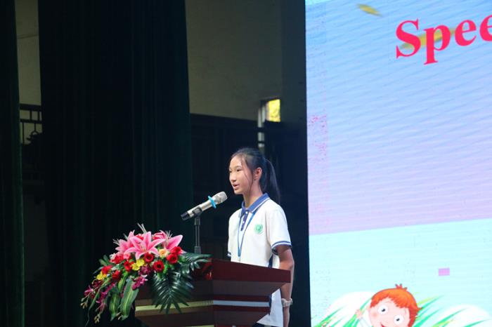 隨后,八年級9班周樂瑤同學作為英語特色班代表發(fā)言。她用流利的英語跟大家分享了自己學習英語經(jīng)歷和方法,感恩育賢提供的英語特色課程讓她的英語學習之路變得多姿多彩,同時她表示英語是接觸世界的一門工具,希望全體同學一起努力學好英語。