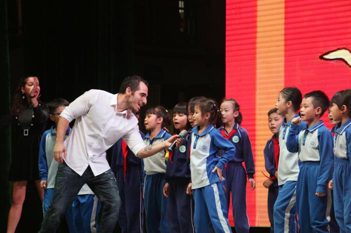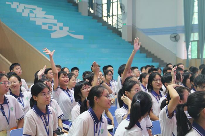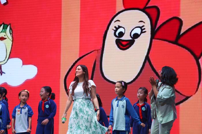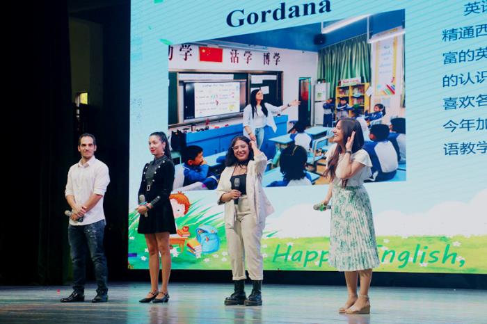 表演結(jié)束后,深受學生喜愛的Jerry、Zoe、Hafsa、Gordana四位外教老師上臺與同學們互動,他們熱情地打招呼,現(xiàn)場歡呼聲不斷。在外教老師的帶領(lǐng)下,全體師生演唱英語歌曲“Na Na Na”,合著音樂的節(jié)奏,臺下同學們熱情高漲,或擊打節(jié)拍,或揮舞手臂,現(xiàn)場的氣氛被點燃。