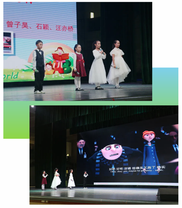接著,小學部梁倩寧、曾子昊、石穎和汪亦橋四位同學帶來了英語動畫配音節(jié)目。該節(jié)目妙趣橫生,小配音演員們在臺上仿佛與角色融為了一體。他們語氣多變、情緒飽滿、時不時還加入夸張的表演,讓場下的觀眾們?nèi)缗R其境,掌聲不斷