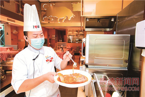 西貝的廚師烹調(diào)烤羊腿。/珠江商報記者朱德文攝